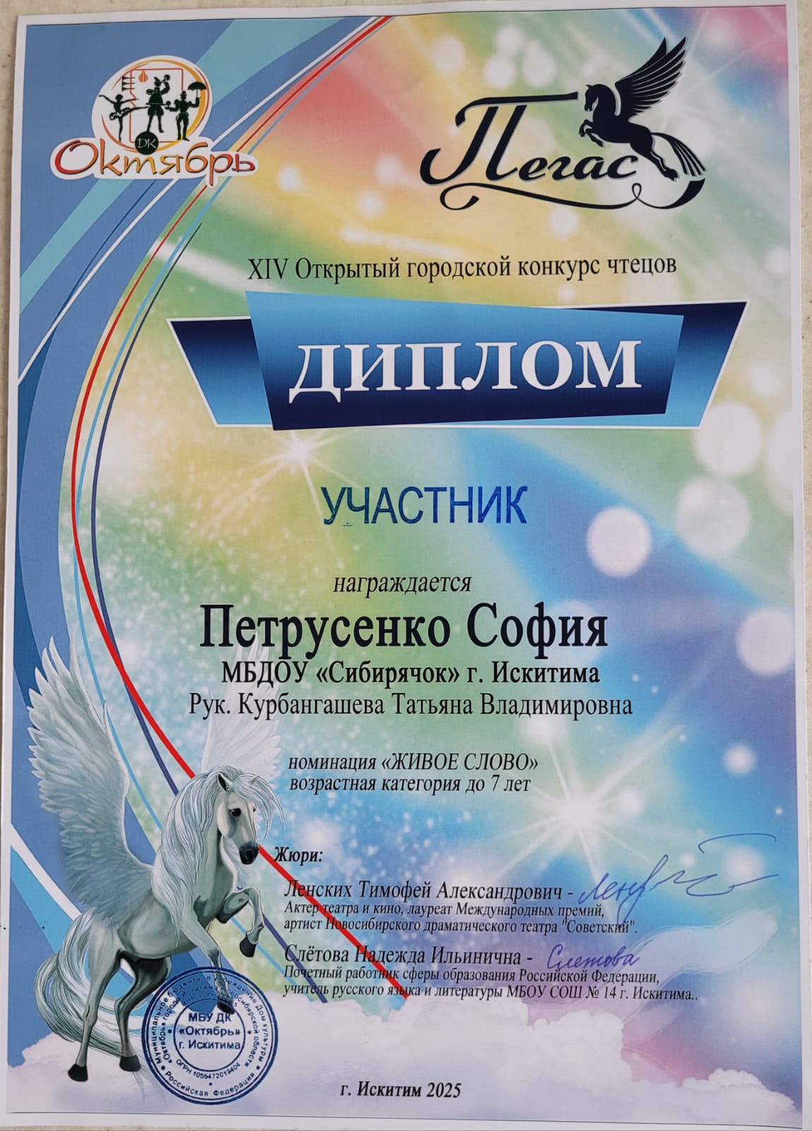 Петрусенко София участник городского конкурса чтецов "Пегас"